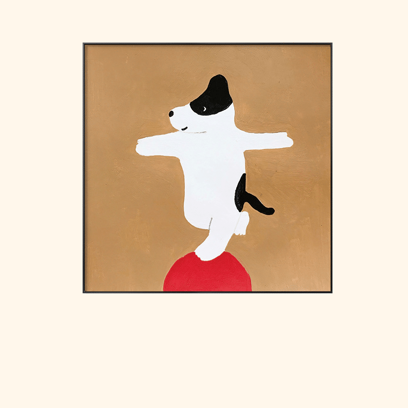 『バランス・ドッグ』は、赤いボールの上で上手に立つ犬が描かれた癒しのアートポスターです。