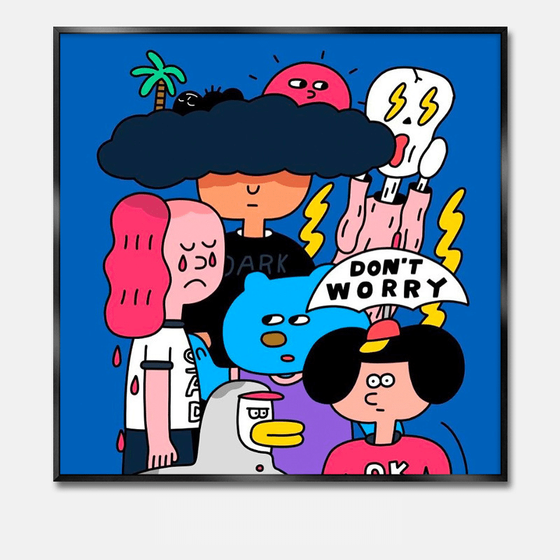 『ドント・ウォーリー』は、カラフルでユニークな表情が印象的なメッセージアートポスターです。