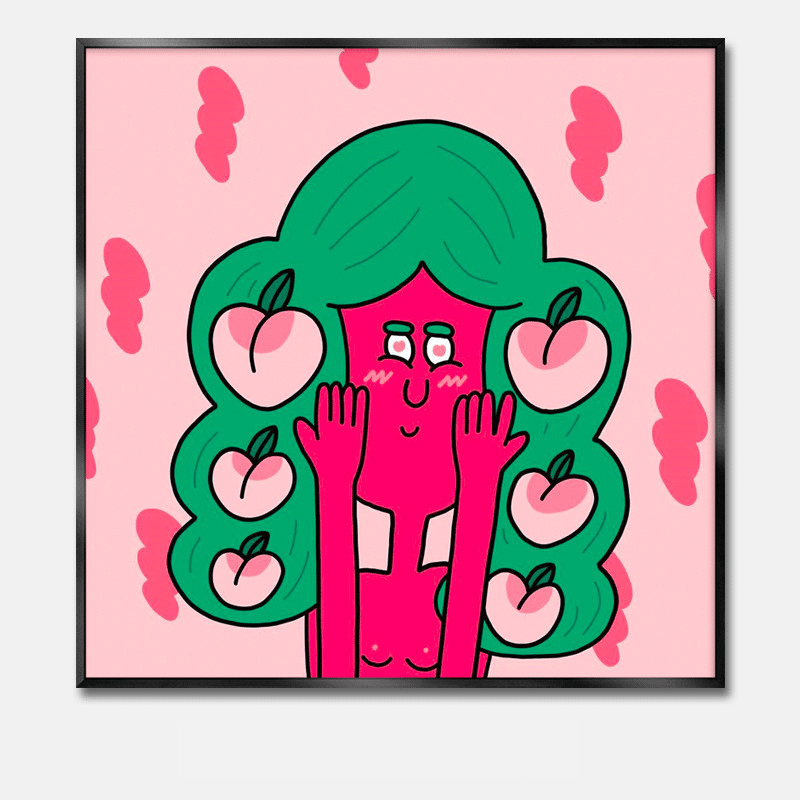 『ピーチ・ヘアー』は、髪の中に可愛い桃が実るユニークなフード&フルーツモチーフ アートポスターです。