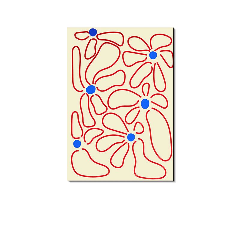 赤いラインで描かれた花のモチーフが印象的な抽象アートポスター。
